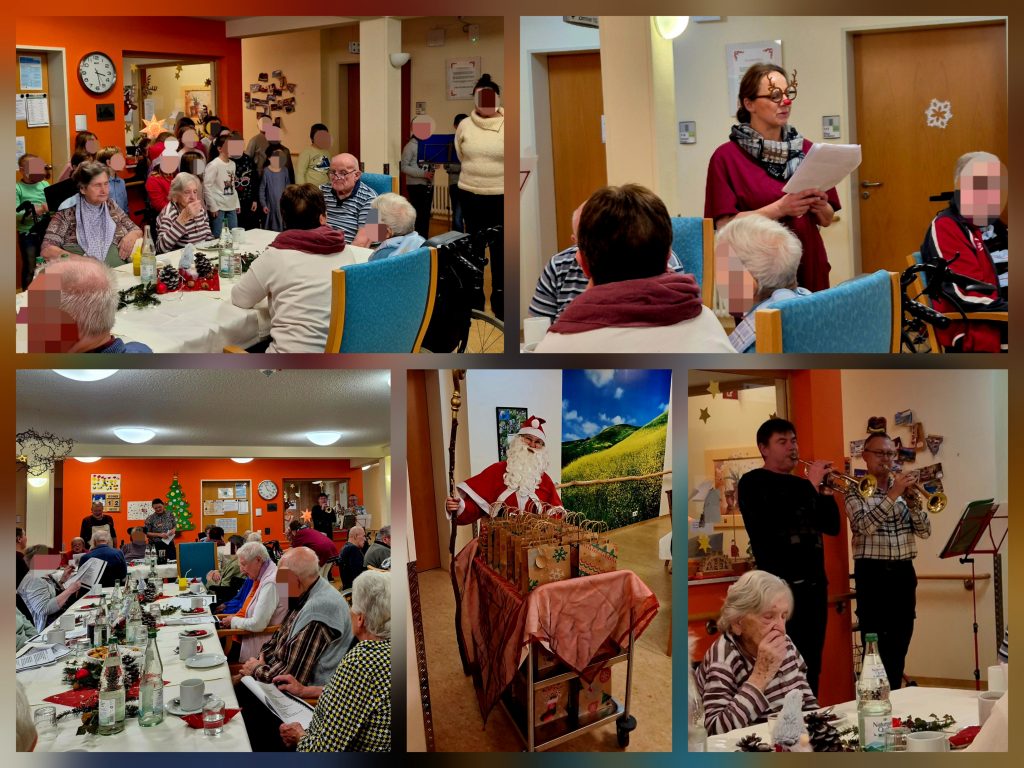 Vergangene Woche durften wir gemeinsam mit unseren BewohnerInnen eine stimmungsvolle Weihnachtsfeier bei uns im Haus erleben. Heimleitung Claudia Sorg eröffnete die Feier mit einer herzlichen Begrüßunng und stimmte alle Anwesenden auf einen besinnlichen Nachmittag ein. Für die musikalische Umrahmung sorgte zunächst der Schulchor. Mit seinen weihnachtlichen Liedern verbreitete der Chor eine festliche Atmosphäre und bereitete viel große Freude. Anschließend begleitet das musikalische Duo Freddy und Werner mit Trompeten das gemeinsame Singen und lud alle BewohnerInnen zum Mitsingen ein. Zwischen den musikalischen Beiträgen wurden weihnachtliche Gedichte und Geschichten vorgetragen, die für ruhige und besinnliche Momente sorgten. Natürlich durften auch die Geschenke nicht fehlen, die mit viel Freude entgegengenommen wurde. Abgerundet wurde der gelungene Nachmittag durch ein traditionelles Abendessen mit Wienerle und Kartoffelsalat. In gemütlicher Runde, bei guten Gesprächen und festlicher Stimmung war es ein schönes Beisammensein, das allen noch lange in Erinnerung bleiben wird.